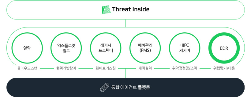 이스트시큐리티는 엔드포인트 보안 위협의 핵심인 악성코드 노하우와 분석 기술을 기반으로 한 알약 백신에서 출발한 알약 EDR과 악성코드 위협 대응 솔루션 Threat Inside와의 연동을 통해 알려진 위협의 차단, 알려지지 않은 위협의 차단과 식별 및 대응까지, 엔드포인트 위협 대응 범위를 확장합니다. 또한 알약, 알약 패치관리(PMS), 알약 내PC지키미 등 엔드포인트 보안 솔루션을 1개의 통합 에이전트로 통합 관리하여 엔드포인트에서 발생하는 위협 행위에 대한 안정적이고 효율적인 정보 수집과 분석으로 조직 내 엔드포인트 보안 가시성을 확보하도록 돕습니다.
